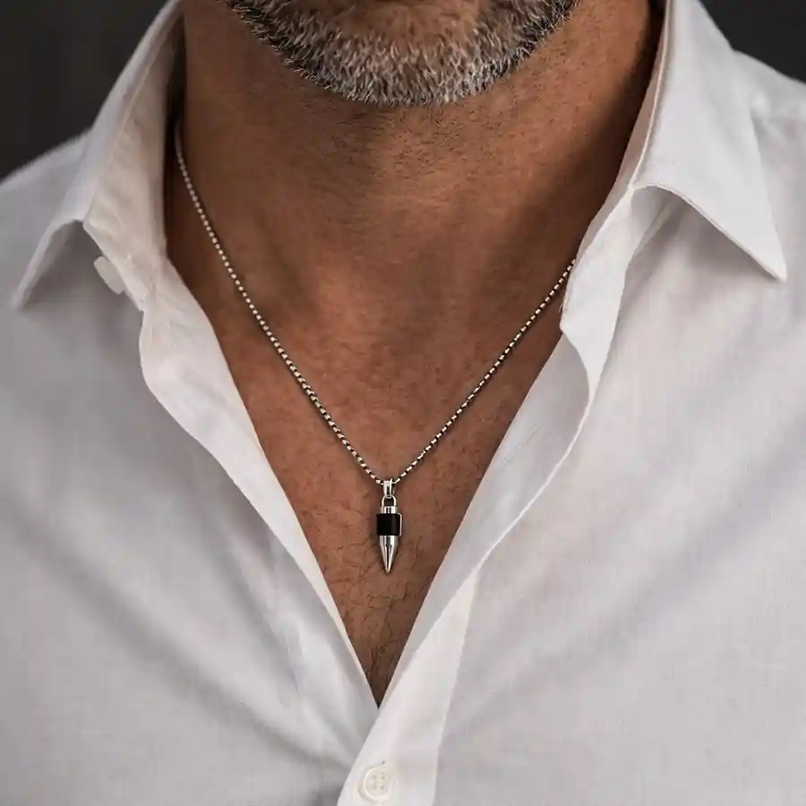 BulletCore Steel Necklace är skapad för mannen som vågar sticka ut. Hänget, inspirerat av en patron, är tillverkat i rostfritt stål med svart mittsektion för en rå och maskulin look.