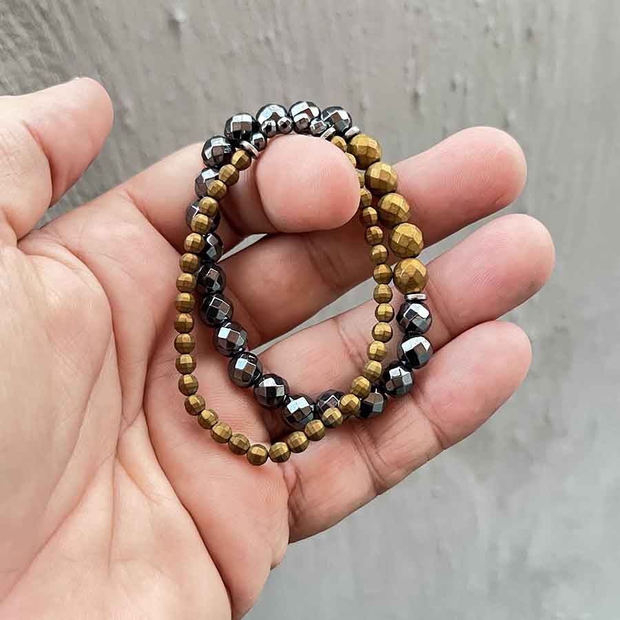 Pärlarmband med grå och gyllene hamatitpärlor och fantastisk glans.