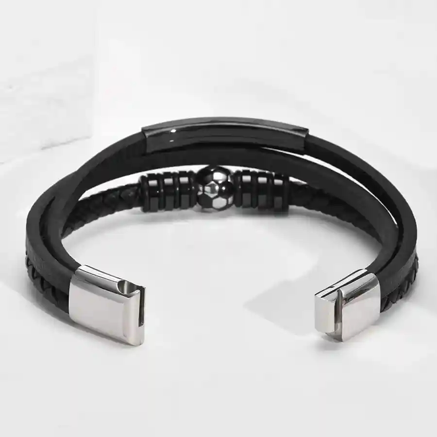 Svart fotbollsarmband i äkta läder och rostfritt stål – herrsmycke med sportig designSvart fotbollsarmband i äkta läder och rostfritt stål – herrsmycke med sportig designSvart fotbollsarmband i äkta läder och rostfritt stål – herrsmycke med sportig design