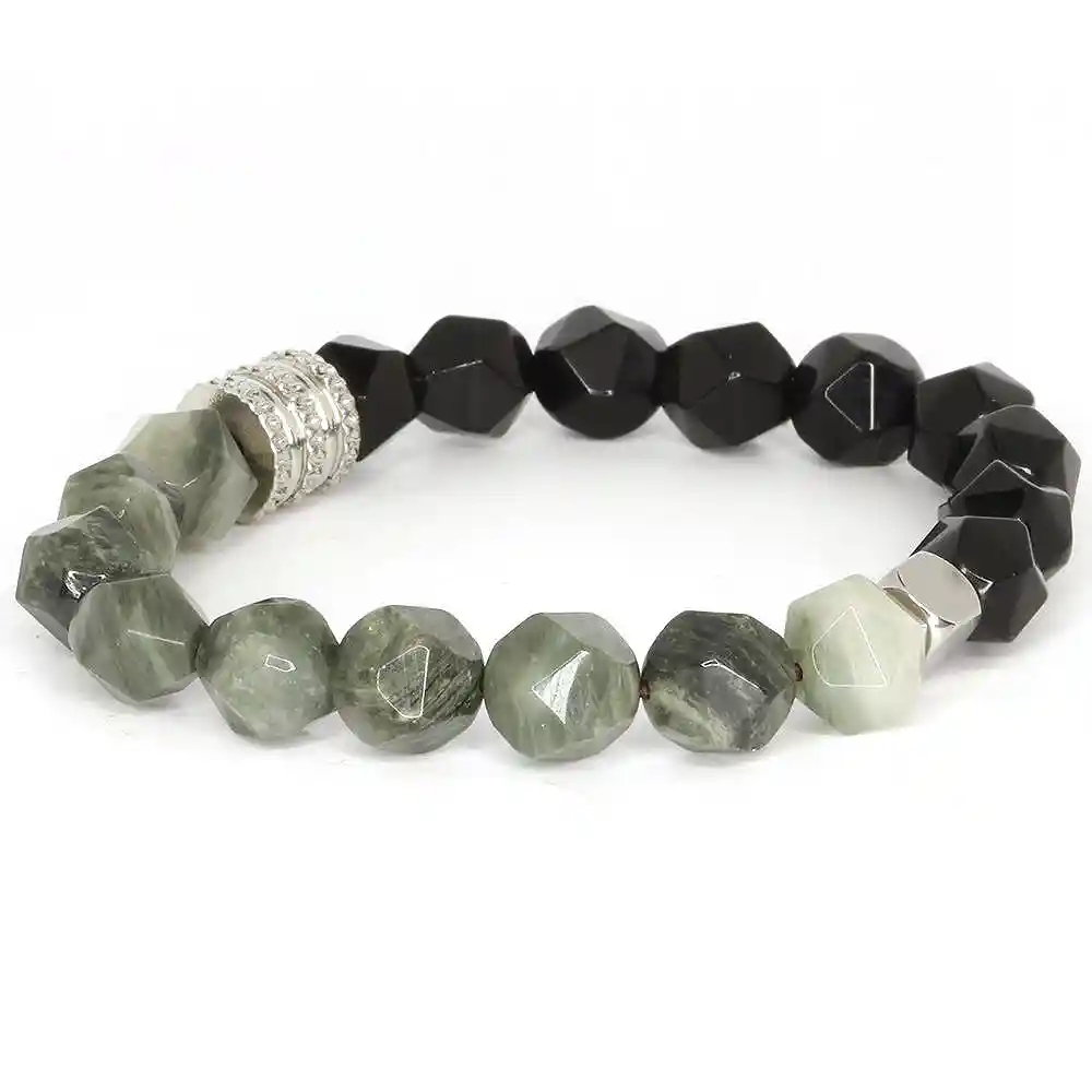 Armbandet är handgjort med 10 mm facetterade gröna naturstenar och svarta agatpärlor, som symboliserar balans, styrka och harmoni.