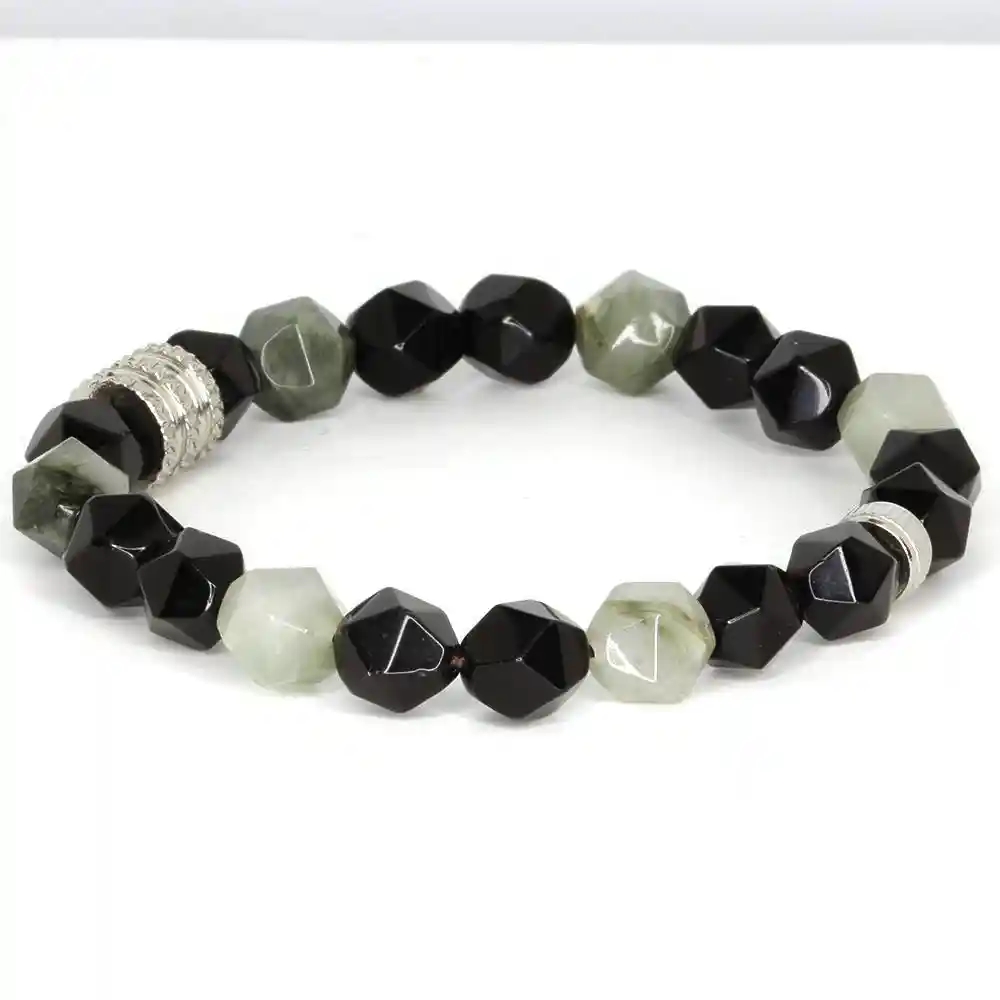 Kombinationen av djupt svarta agatpärlor och 10 mm facetterade gröna naturstenar skapar ett unikt samspel mellan styrka och lugn.