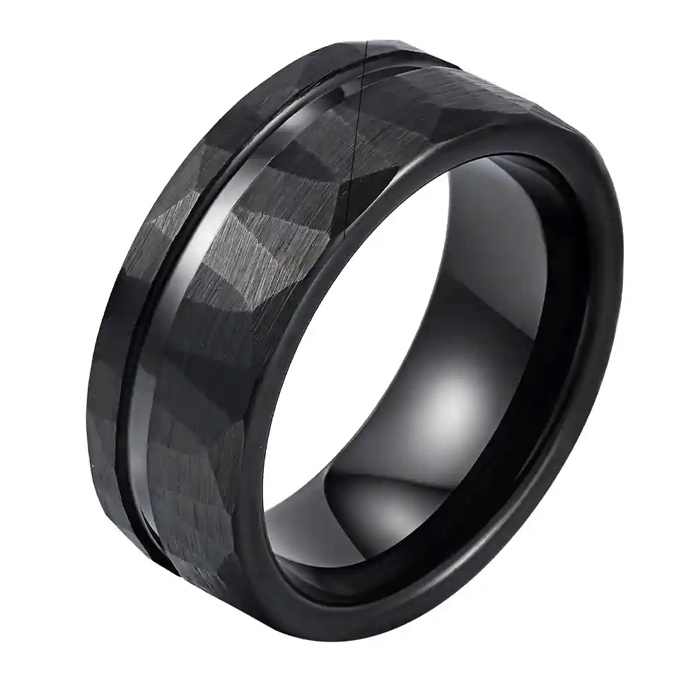 Obsidian Edge är en svart tungstenring för män, designad med en markant facetterad yta och en matt polerad kant, som ger ett rått och exklusivt uttryck.