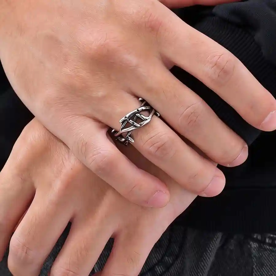 Denna markanta herrring är tillverkad i oxiderat rostfritt stål och har en rå, kedjeinspirerad design som ger ringen ett maskulint och edgy uttryck. Den oxiderade finishen framhäver detaljerna i designen och ger ringen ett slitet, industriellt utseende – perfekt för män som önskar ett smycke med attityd.