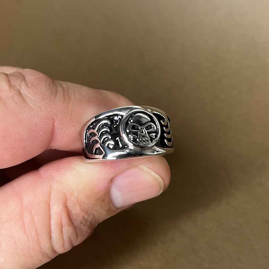Tillverkad i hållbart rostfritt stål (316L) och präglad med ett unikt skull motiv.