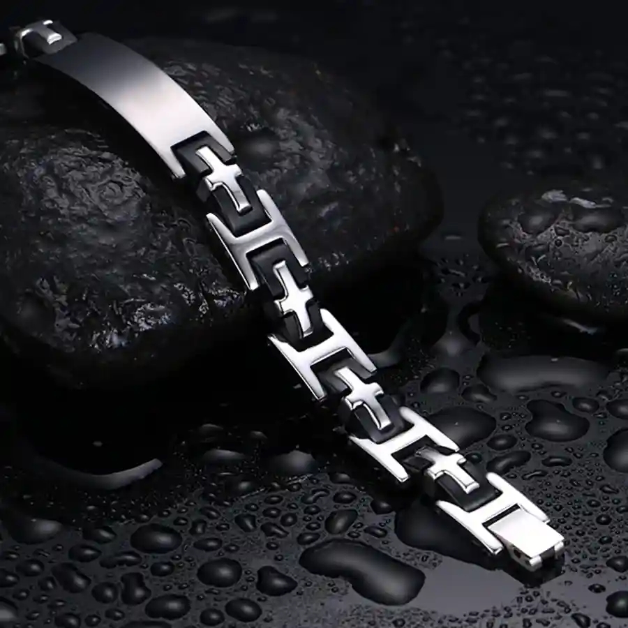 Ett stilrent och maskulint armband för män, tillverkat i rostfritt stål och svart silikon.