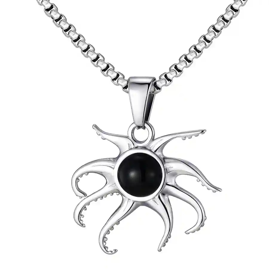 Herrhalsbandet här kombinerar rå styrka och detaljerad design i ett iögonfallande smycke. Hänget är format som en kraftfull bläckfisk med slingrande armar och en djupt svart sten i mitten, som ger ett mörkt och maskulint uttryck.
