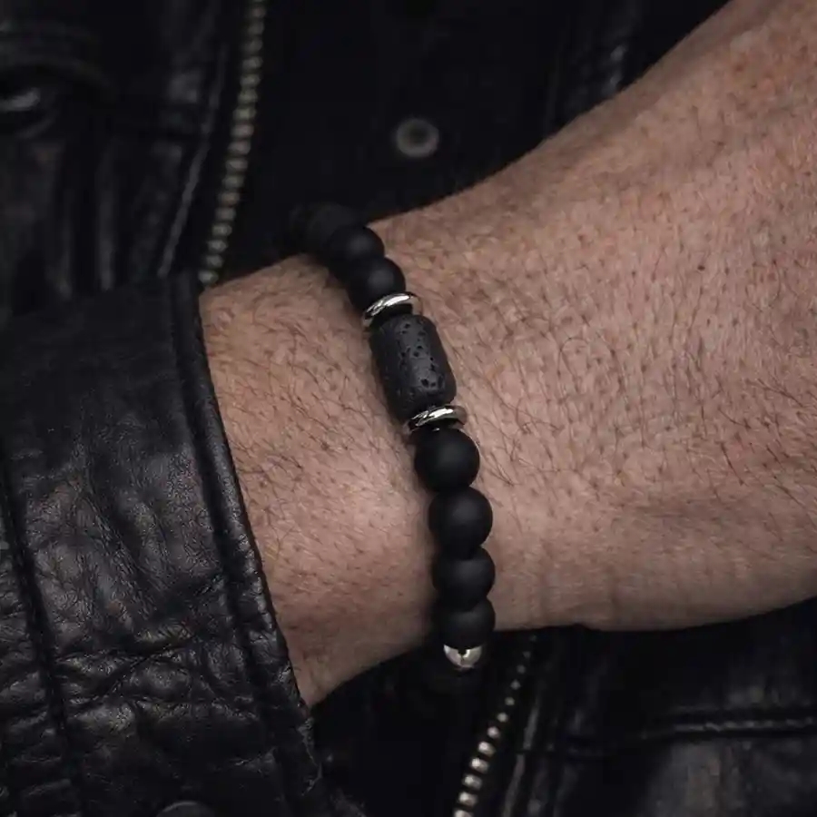 Svart pärlarmband för män kombinerar 8mm blackstone-pärlor, råa lavapärlor och blanka hematitdetaljer i en stilren och maskulin design. Kontrasten mellan de matta stenarna och de polerade metallpärlorna ger armbandet ett exklusivt, men rått uttryck – perfekt för den moderna mannen.