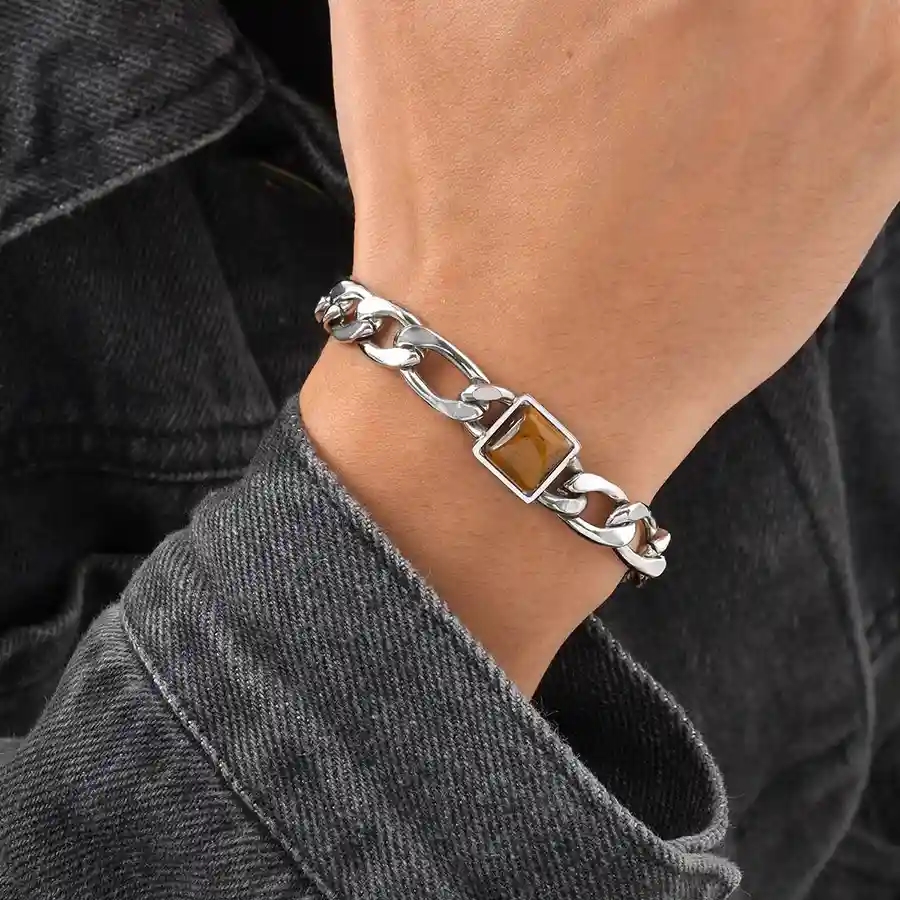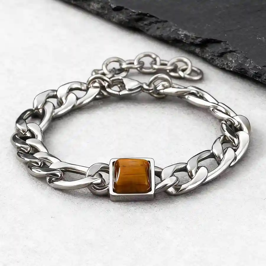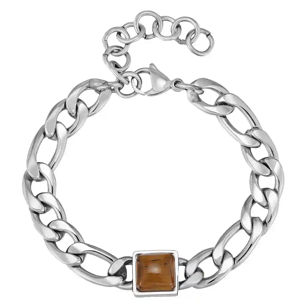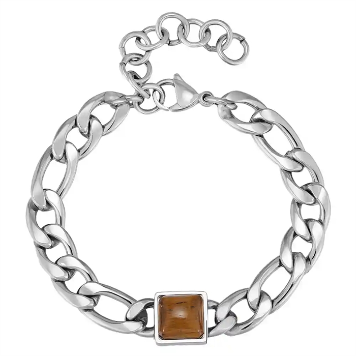 Detta stilrena herrarmband kombinerar en klassisk kedjedesign i rostfritt stål med en markant fyrkantig Tiger Eye-sten i mitten. Den varma bruna stenen skapar en fin kontrast till det blanka stålet och ger armbandet ett exklusivt och maskulint uttryck.