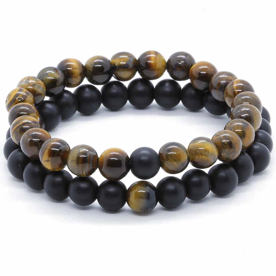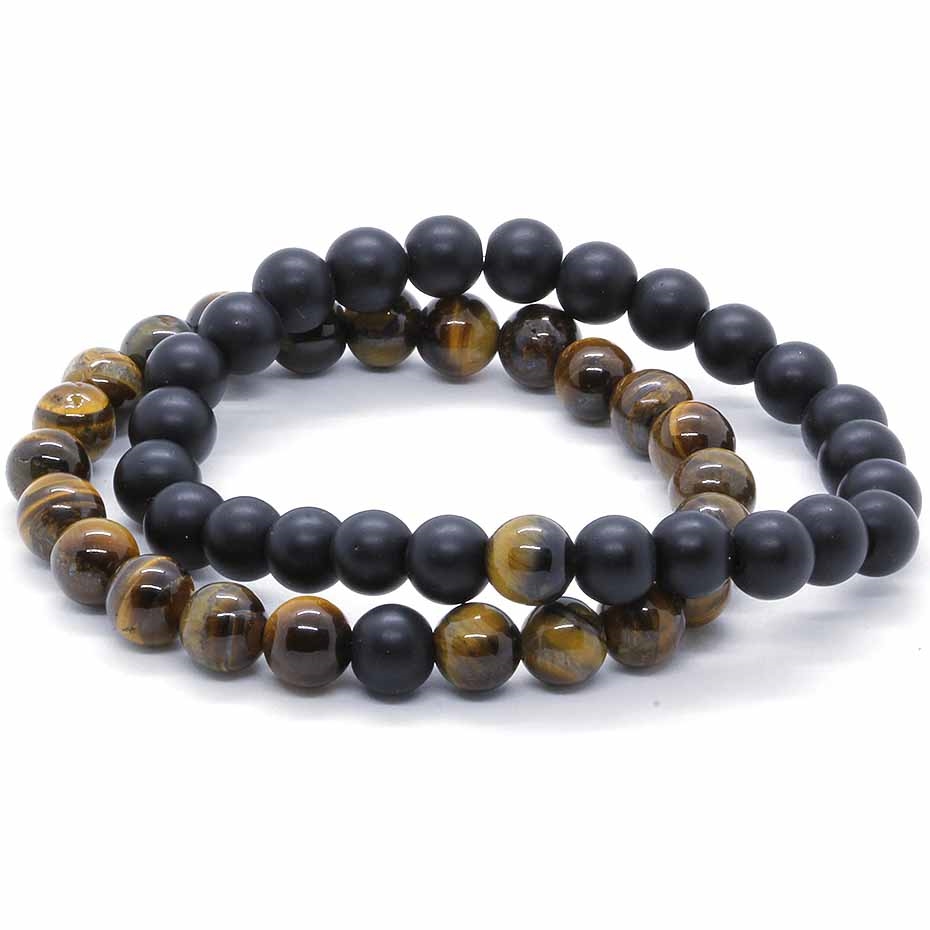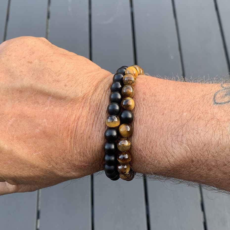 Lägg till maskulin energi med detta dubbla herrarmband i 8 mm onyx- och tigereye-pärlor. Matt svart möter varm brun glöd i ett set som både kan bäras tillsammans och var för sig. Ett tidlöst accessoar för honom som vill ha ett rått, stilrent och kraftfullt uttryck.