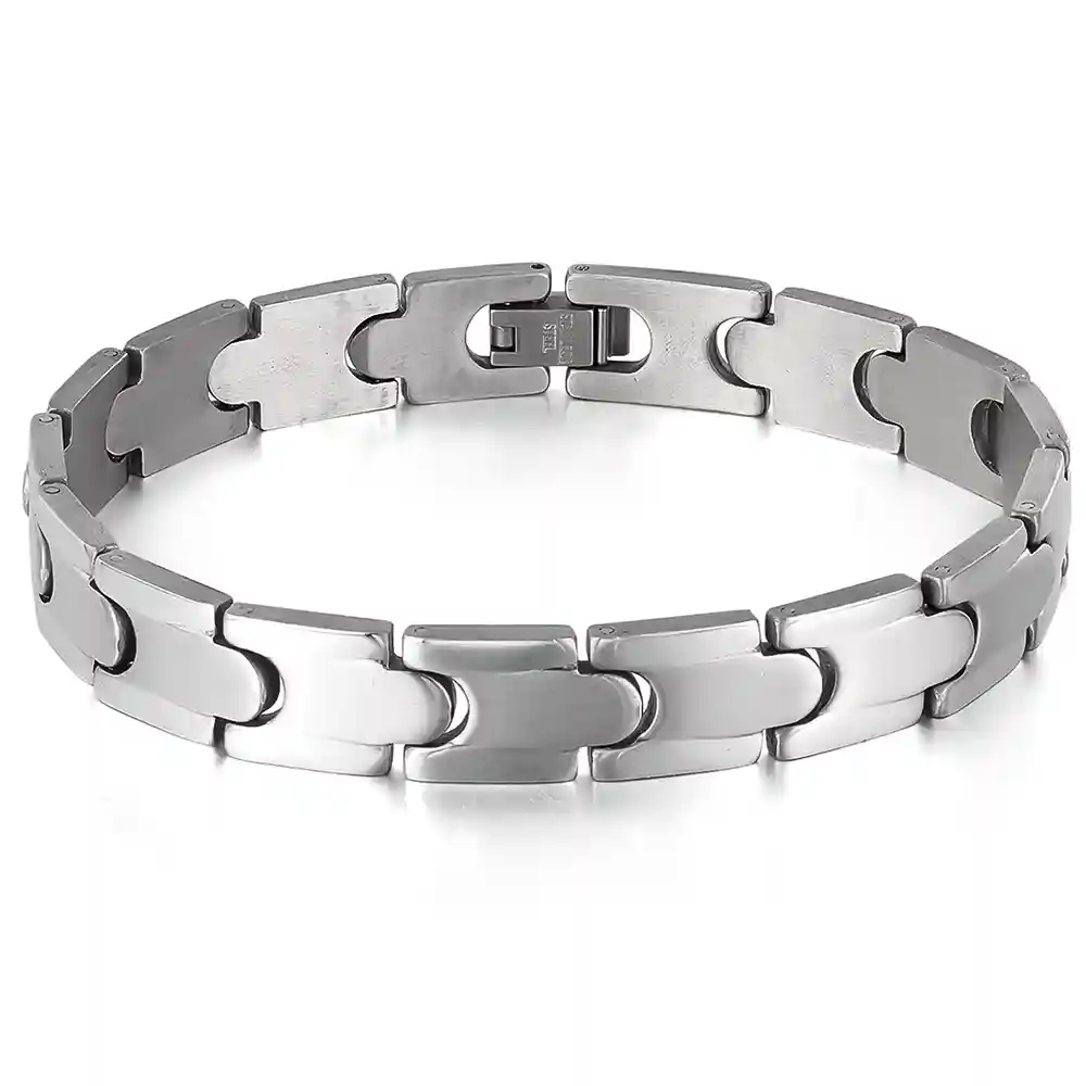 Armbandet är tillverkat i rostfritt stål med en exklusiv kombination av matt och blankpolerade länkar, som ger ett distinkt och stilrent uttryck.